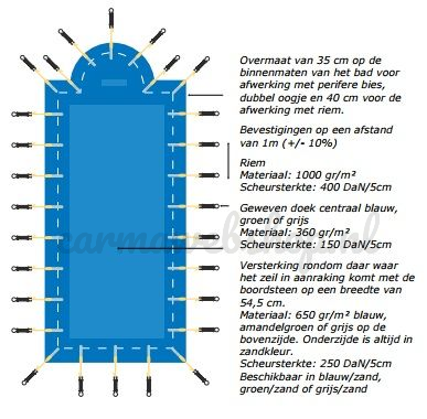 Geleverd inclusief riem + RVS haak, hiermee kunt u het zeil vast zetten in steen. Duurzaam en sterke afdekking. Afdekking inclusief bevestigingen en Pullup pluggen. Lichtgewicht afdekking – 650gr per 1m2Inclusief opbergzak voor de afdekking. Inclusief elastieken. Inclusief speciale pullup pluggen dubbel oogje bevestiging.